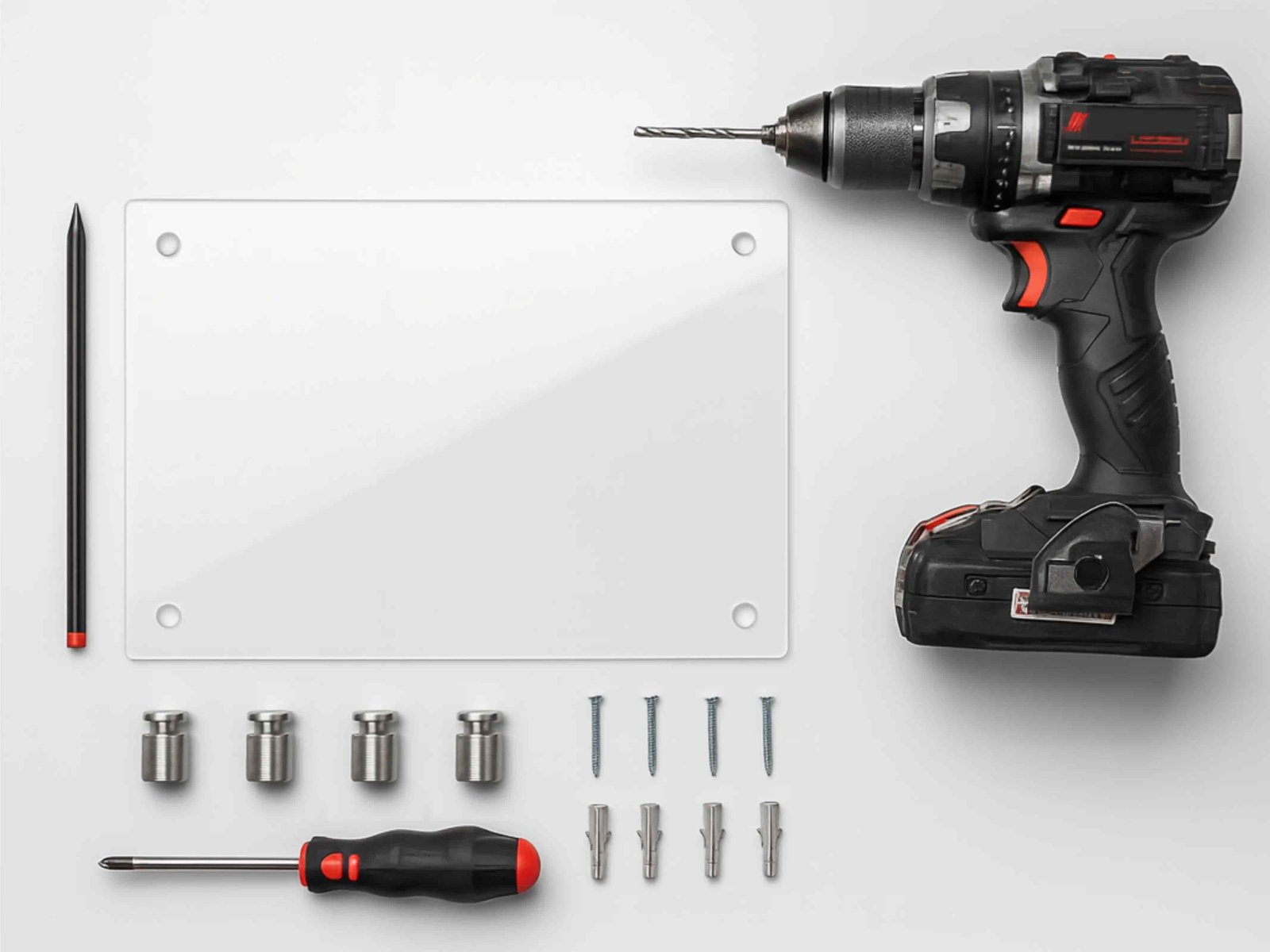 Trapano, tasselli e viti: Per fissare una targa in plexiglass serve un trapano, generalmente con punta da 5mm. Le viti e i tasselli devono essere compatibili con i distanziali che utilizzerai per il montaggio.