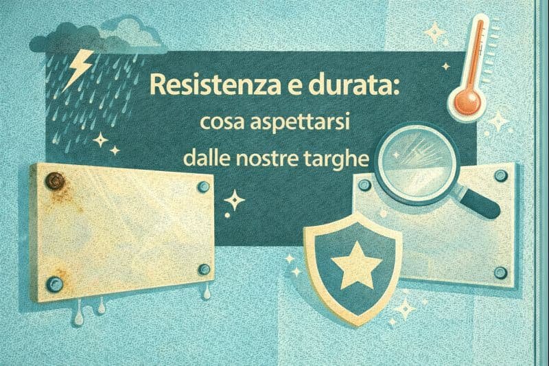Una targa dura quando unisce materiali stabili, una finitura adeguata al contesto e una grafica protetta (inchiostri o incisione). La protezione contro i raggi UV evita lo sbiadimento, la corretta scelta dello spessore limita le deformazioni, mentre la finitura giusta (satinata o lucida) gestisce i riflessi e riduce i segni d’uso.