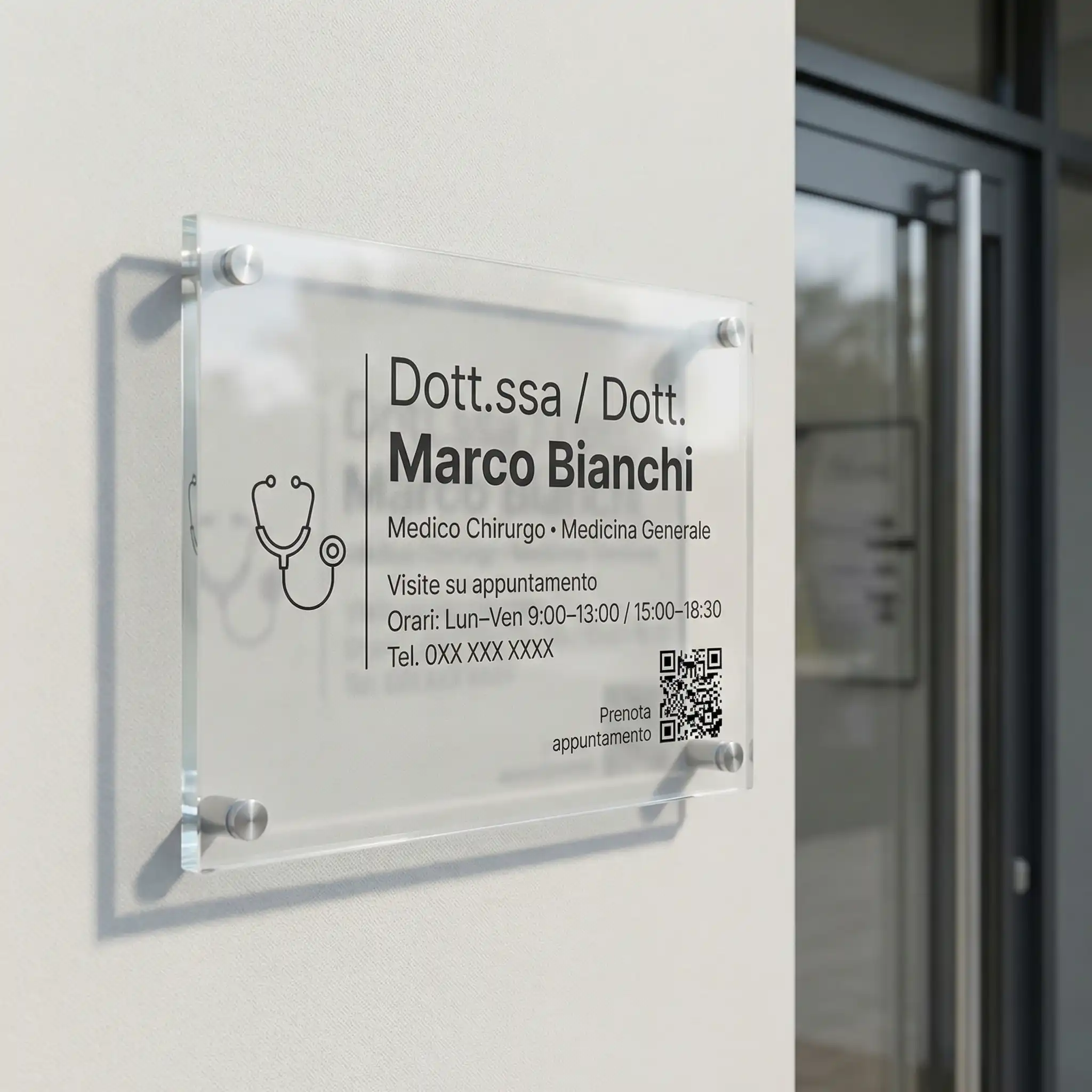 Il nostro team ti supporta nella progettazione e nella verifica del QR affinché la scansione sia immediata nella luce reale del tuo ingresso. Ti aiutiamo a scegliere il formato, la finitura, la dimensione corretta del codice e la micro-copy più chiara, con bozza di approvazione prima della produzione. Le nostre targhe sono idonee all'applicazione di qr code per il tuo studio.