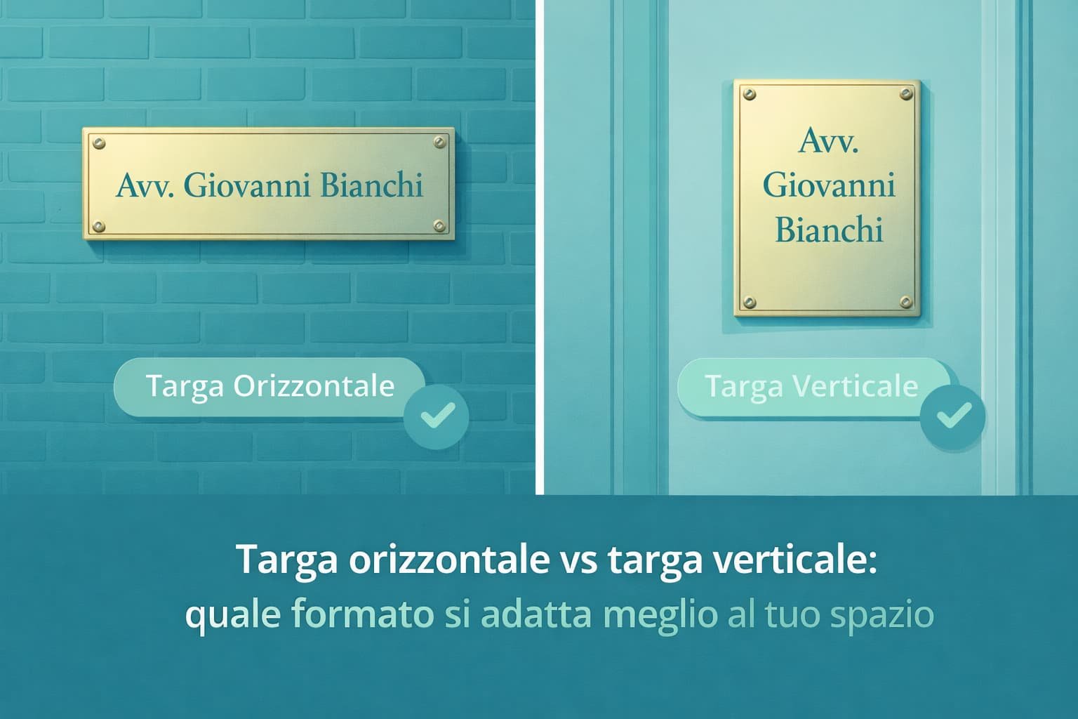 Pro della targa verticale: risolve bene gli spazi “a colonna” (per esempio tra una porta e una vetrina, o su una spalla di muro), e permette una gerarchia più chiara: in alto il nome, al centro la professione, in basso orari o piano interno.
