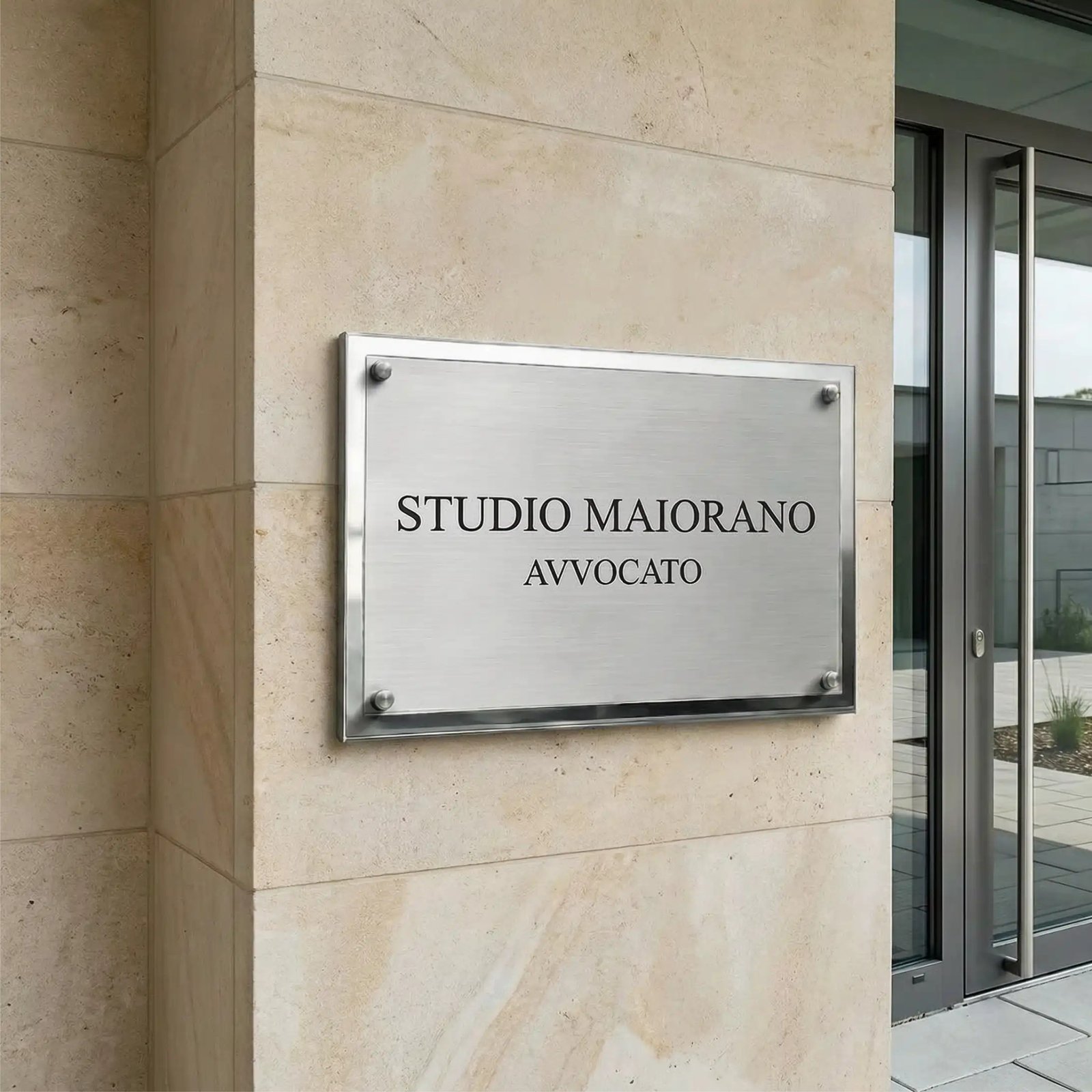La finitura lucida del bordo conferisce a questa targa in alluminio un aspetto sofisticato, ideale per spazi professionali e residenziali.