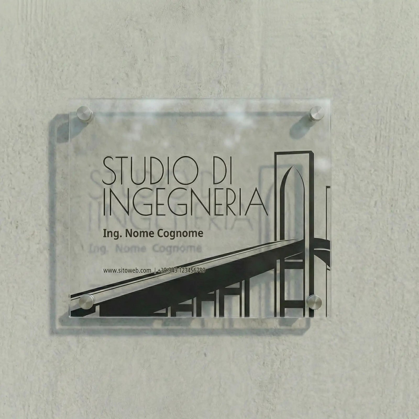 Linee nette, trasparenza e un profilo strutturale che parla la tua lingua. Plexiglass cristallino con grafica architettonica in nero: ponte, skyline e il tuo nome. Ogni dettaglio comunica rigore progettuale prima ancora di stringere la mano.