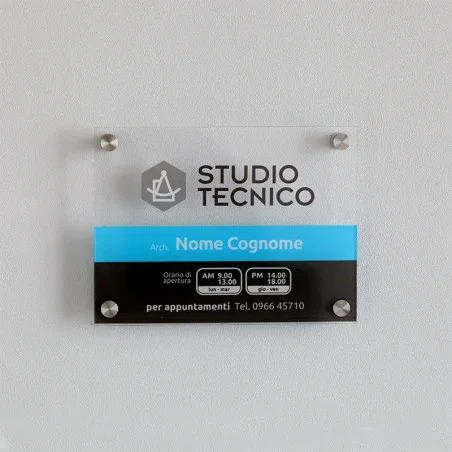 - Plexiglass: Elegante e moderno, il plexiglass è ideale per ambienti interni come uffici e studi professionali. È trasparente, luminoso e personalizzabile con incisioni o stampe ad alta risoluzione. Perfetto per un design minimalista e raffinato.