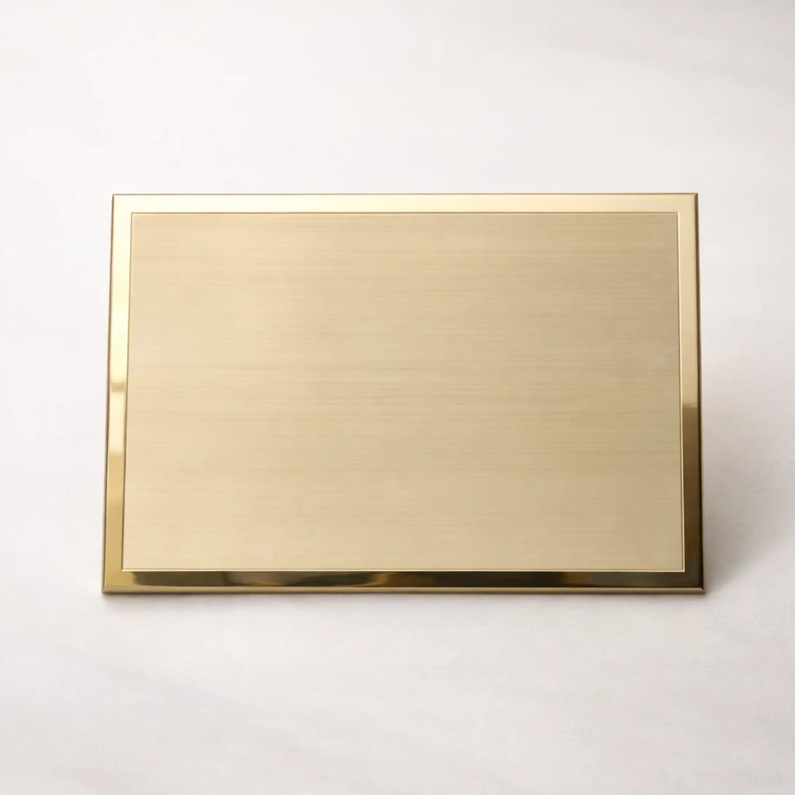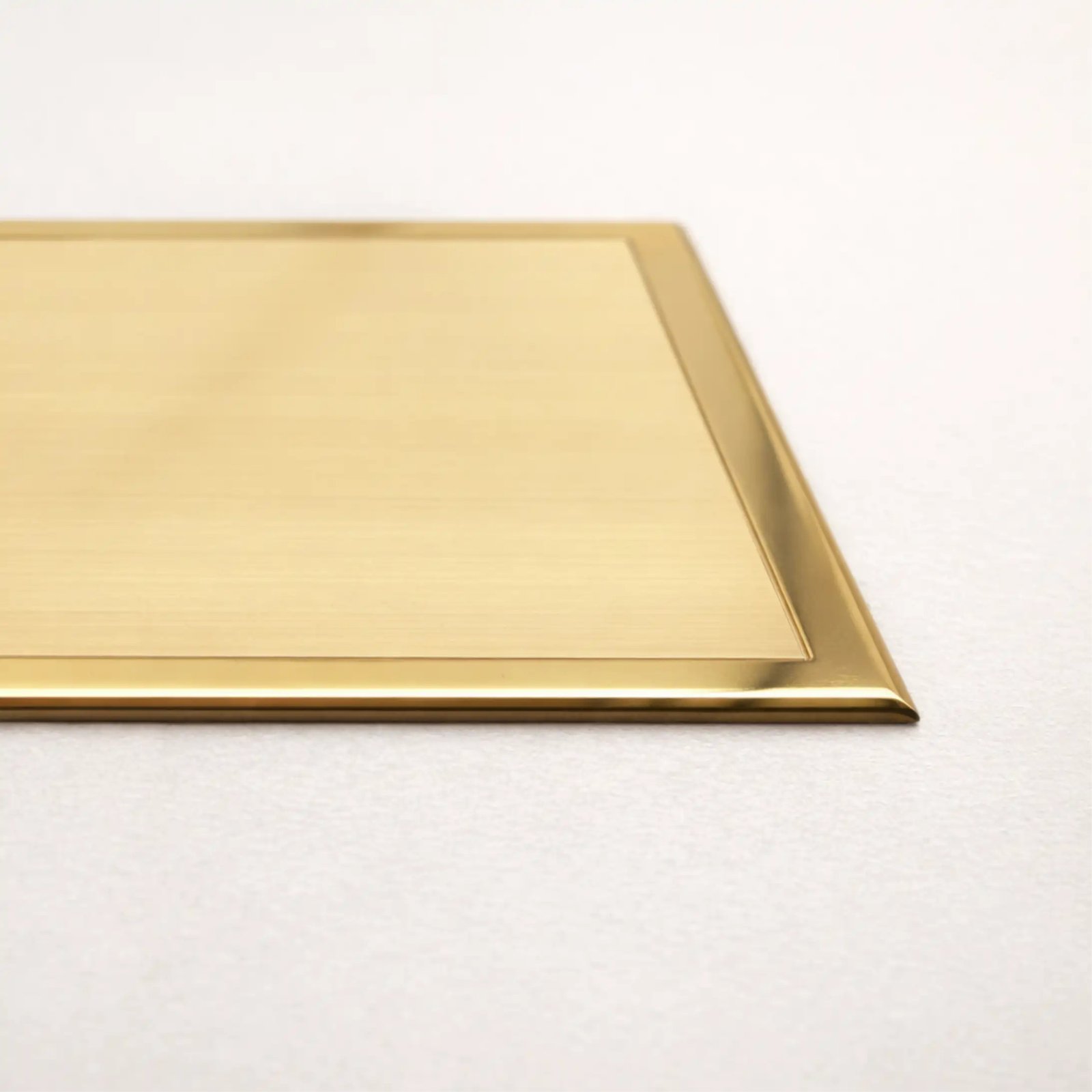 Tra tutte le targhe in ottone incise, quelle con finitura satinata bordo lucido offrono il miglior equilibrio tra leggibilità e impatto visivo. L'incisione emerge con nitidezza sulla superficie opaca, senza essere ostacolata da riflessi, mentre il bordo lucido aggiunge una dimensione visiva che la sola superficie satinata non potrebbe offrire. Il risultato è una targa che lavora bene a distanza ravvicinata e a distanza di lettura, in qualsiasi condizione luminosa.