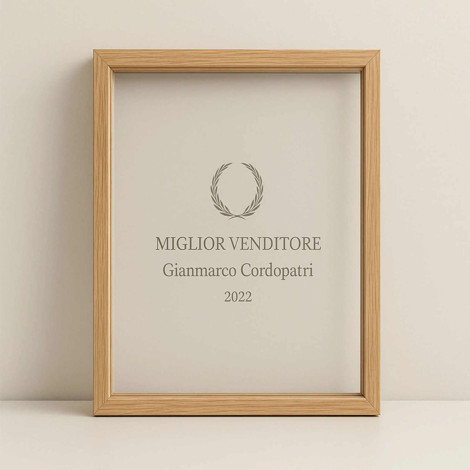 Targa Premio con cornice in legno dal tono naturale con incisione su trasparente: design minimal che valorizza risultati aziendali e sportivi con stile.