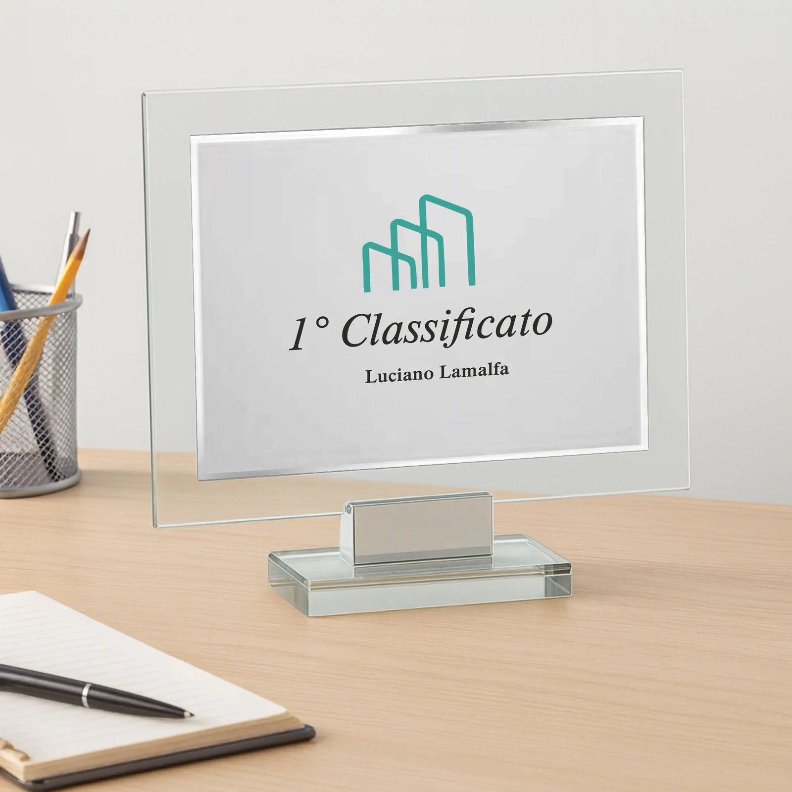 Targa premio rettangolare in plexiglass con linee pulite, effetto vetro: placca rettangolare trasparente con supporto da scrivania. Incidi la tua dedica e celebra con stile.
